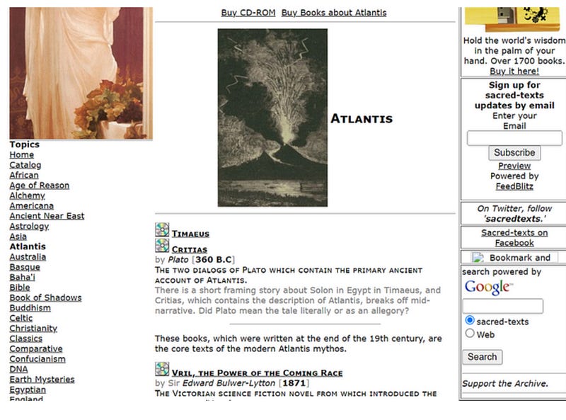 我們建議您在探索互聯網聖文檔案館的這一部分之前,先閱讀我們的《亞特蘭蒂斯的事實與幻想》一文。儘管市面上有許多關於亞特蘭蒂斯的現代著作,但其中大多數要麼只是早期優秀作品的翻版,要麼僅宣揚該書作者偏好的理論;這自然會與其他作者的觀點相衝突!雖然閱讀這些書籍作為娛樂無可厚非(我們會稱其為「小說」,因為大多數並不涉及真實),但如果您追求科學事實,可供選擇的書籍就較為有限。我們推薦伊格內修斯·唐納利(Ignatius Donnelly)所著的《亞特蘭蒂斯,前洪水世界》(Atlantis, the Antediluvian World),以及柏拉圖在《提邁歐篇》和《克里提亞篇》中對這片失落大陸的描述。有關亞特蘭蒂斯的更多閱讀建議,請參閱我們的其他文章。
