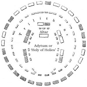 巨石陣是為了紀念太陽而呈現圓形的。其次,如上圖所示,中央聖所是橢圓形的。這象徵著世界蛋,或是任何行星、太陽系,甚至生物的形狀,亦或是代表著環繞所有生物的能量場或磁場。祭壇上的聖火永不熄滅。我們在另一篇文章中提到了這種精神上的「火」,同時描述了曾在英國石圈內舉行的神聖儀式。若你尚未閱讀這篇文章,現在正是最佳時機,因為透過這樣你將了解數千年前在巨石陣上發生的事情:當時,德魯伊的大祭司身穿純白長袍,召喚了天上之火到人間,並以其活躍之光治癒 眾人。