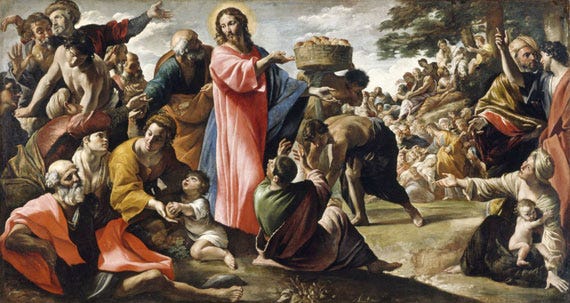 在福音書中,耶穌同樣仰望著天,將祝福的餅和魚餵飽眾人。