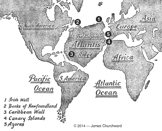 由于这个原因,关于亚特兰蒂斯在特定时期的模样,要制作任何地图来准确描述是相当不可能的。我们只需想想在过去两千年中,伦敦的大小和外观经过多少次的变化,就可以看到这种做法是徒劳的。话虽如此,我们认为提供一张非常近似的地图是无害的,正如詹姆斯-丘克沃德(James Churchward )在他的书中所做的那样。这张图说明亚特兰蒂斯在其文明鼎盛时期时,可能的规模和位置,我们将这样一张地图转载如文章一开头所示。