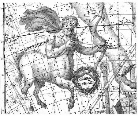 古老的歌声在岁月中回荡,穿越肥沃的平原,在阳光普照的山顶上,在树林茂密的山谷黑暗洞穴中,甚至穿越起风波涛的海面。无论身处何地,他们都唱出了神圣原则与动物原则的融合。他们歌颂了牛人、鸟人、蛇人、狮子人,甚至与蝎子融为一体的人。然而,无论最初是什么形象,长久以来,射手座普遍被描绘为人和马的结合体,其中人的部分是一个手持弓箭的弓箭手。有人说,弓箭手将箭瞄准了天蝎座。