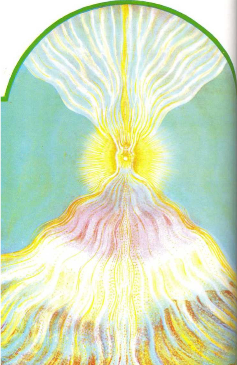 产生所有形式的创造能量,首先通过「话语」(Word)发出声音。「话语」可以被认为产生于一个精神中心的「源头」,在物质上由太阳代表。这些能量在其源头具有巨大的效力。从太阳大天使们到行星天使们的整个众神种族,都在某种程度上充当了电力变压器。他们把原始、创造性的力量接受到自己身上,并且以类似通过抵抗它流动的方式来降低它的「电压」。从太阳众神开始,它通过他们较小的弟兄们,一个个层级地传递,直到到达了物质世界。在那里,在自然神灵的帮助下,它把物质变成「创造力心灵」(Creative Mind)所构想的形状。